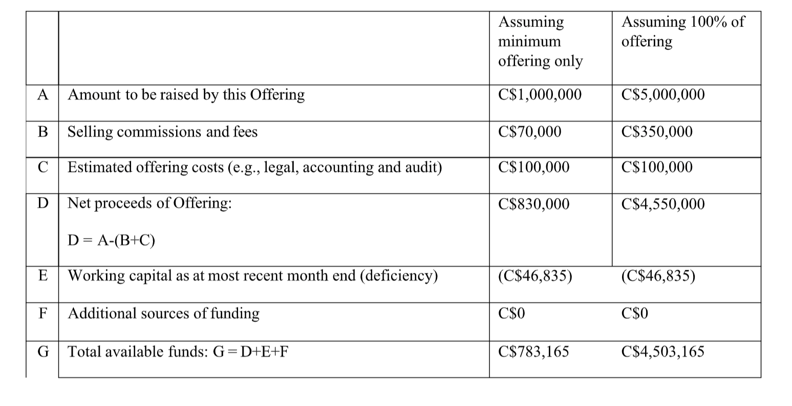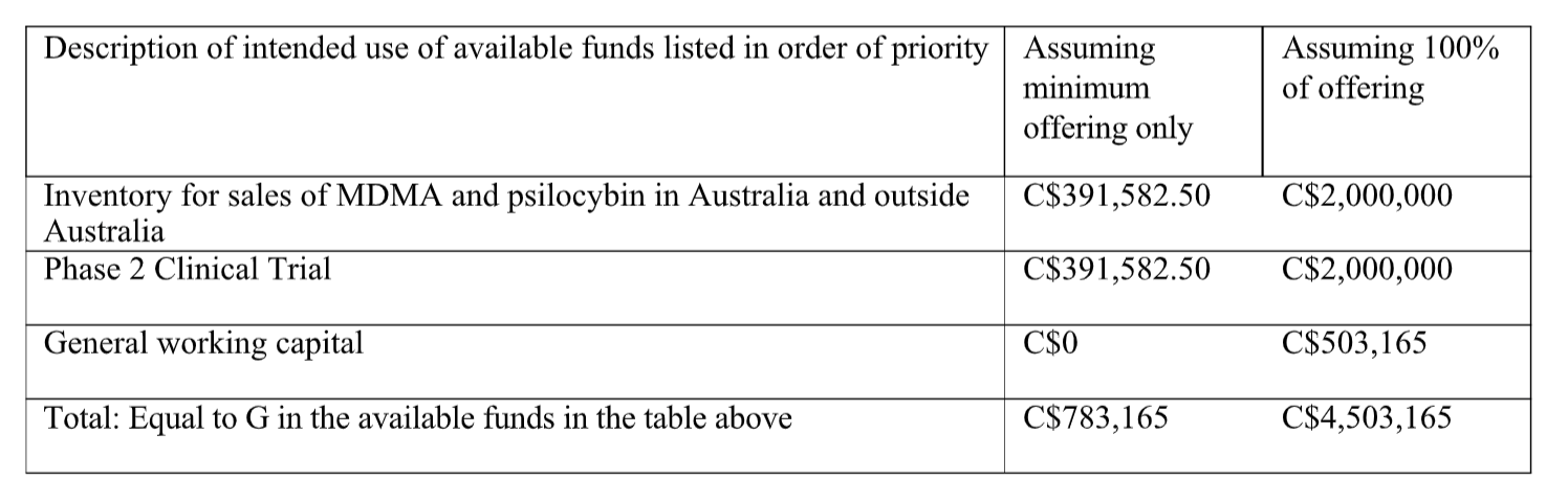 If the Issuer raises less than C$5,000,000 from the Offering, the funds will be allocated on a pro-rated basis, where 50% of the funds will be allocated towards the increase of MDMA and psilocybin inventory for the future sales in Australia and outside Australia and 50% of the funds will be allocated to conduct the Phase 2 Clinical Trial.